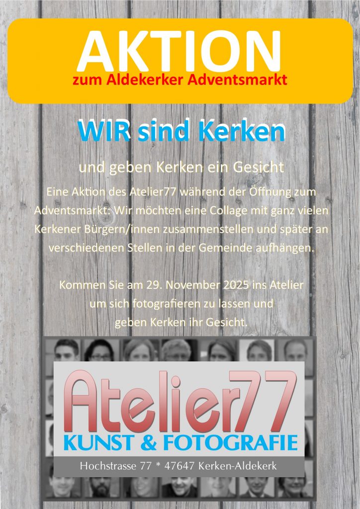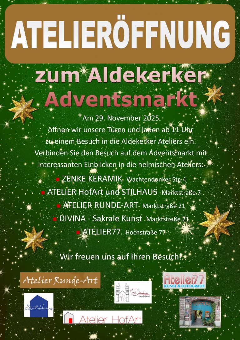 Zusammen mit den in Aldekerk ansässigen Ateliers werde ich mit meinen Kollegen Andreas Kamps und Axel Möller unser Atelier77 öffnen und dort einen Querschnitt unserer Arbeiten zeigen. Desweiteren haben wir uns eine besondere Aktion ausgedacht: