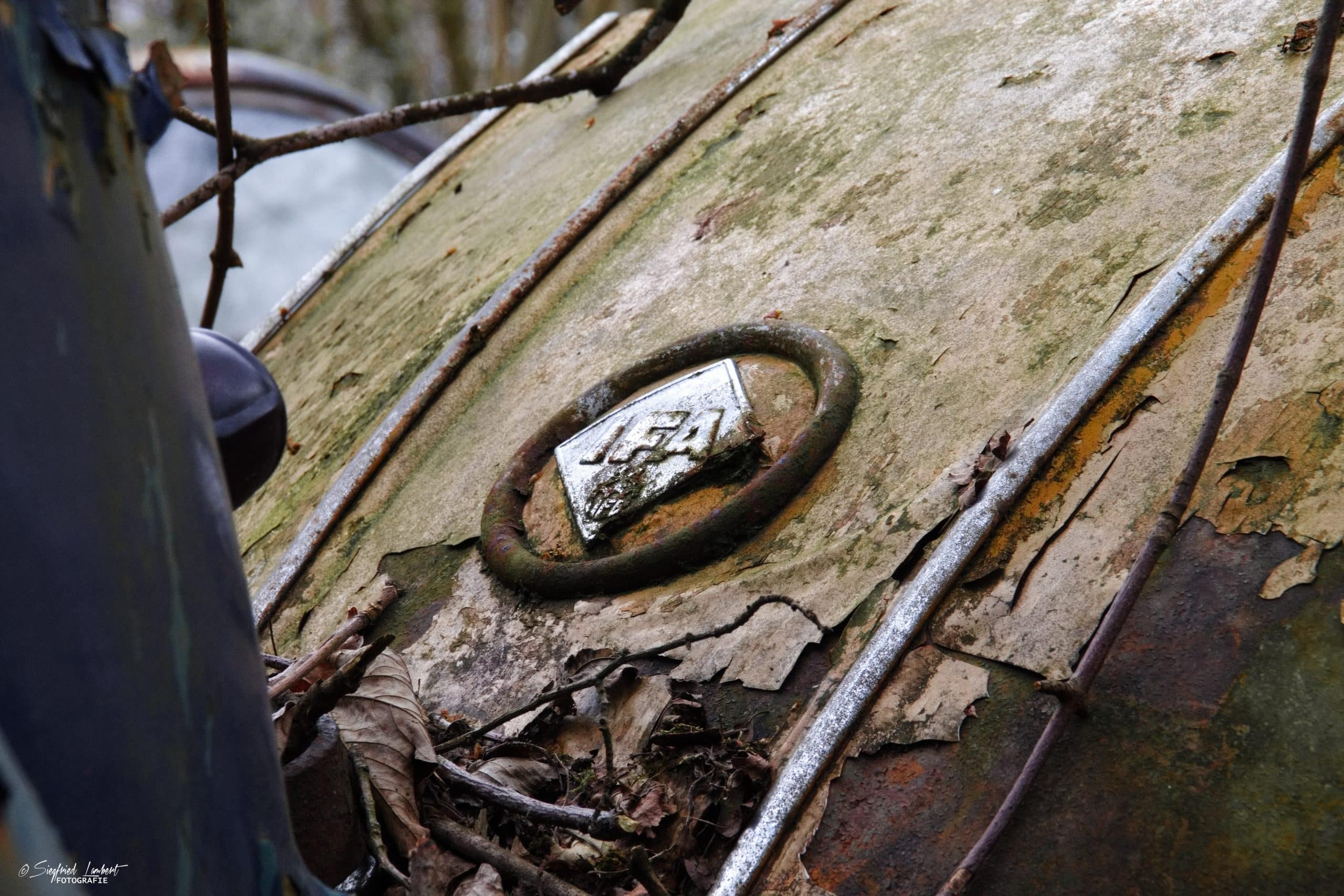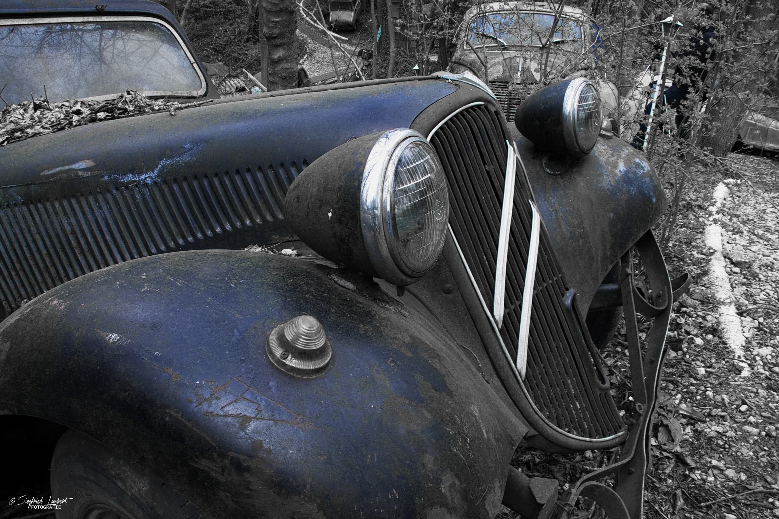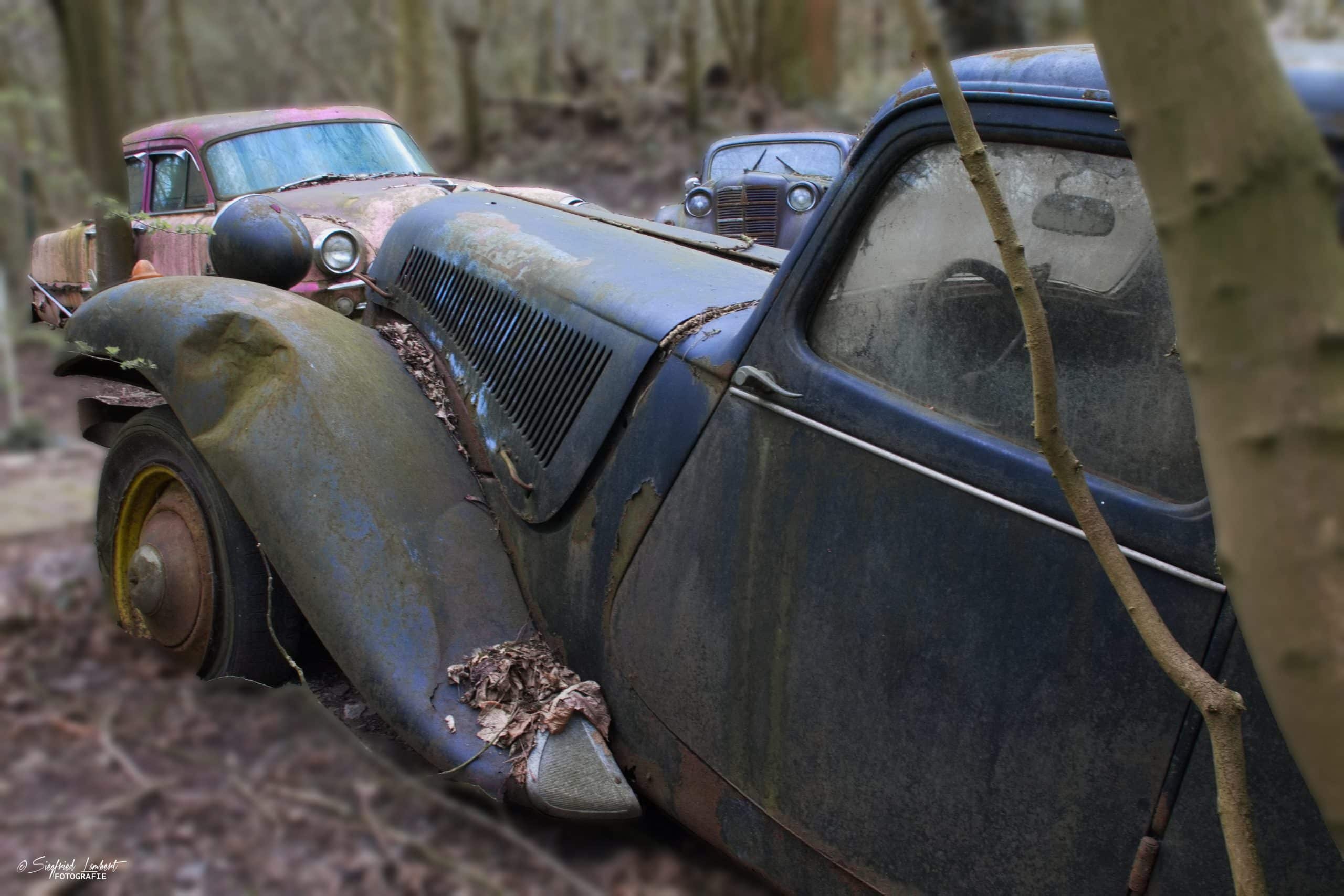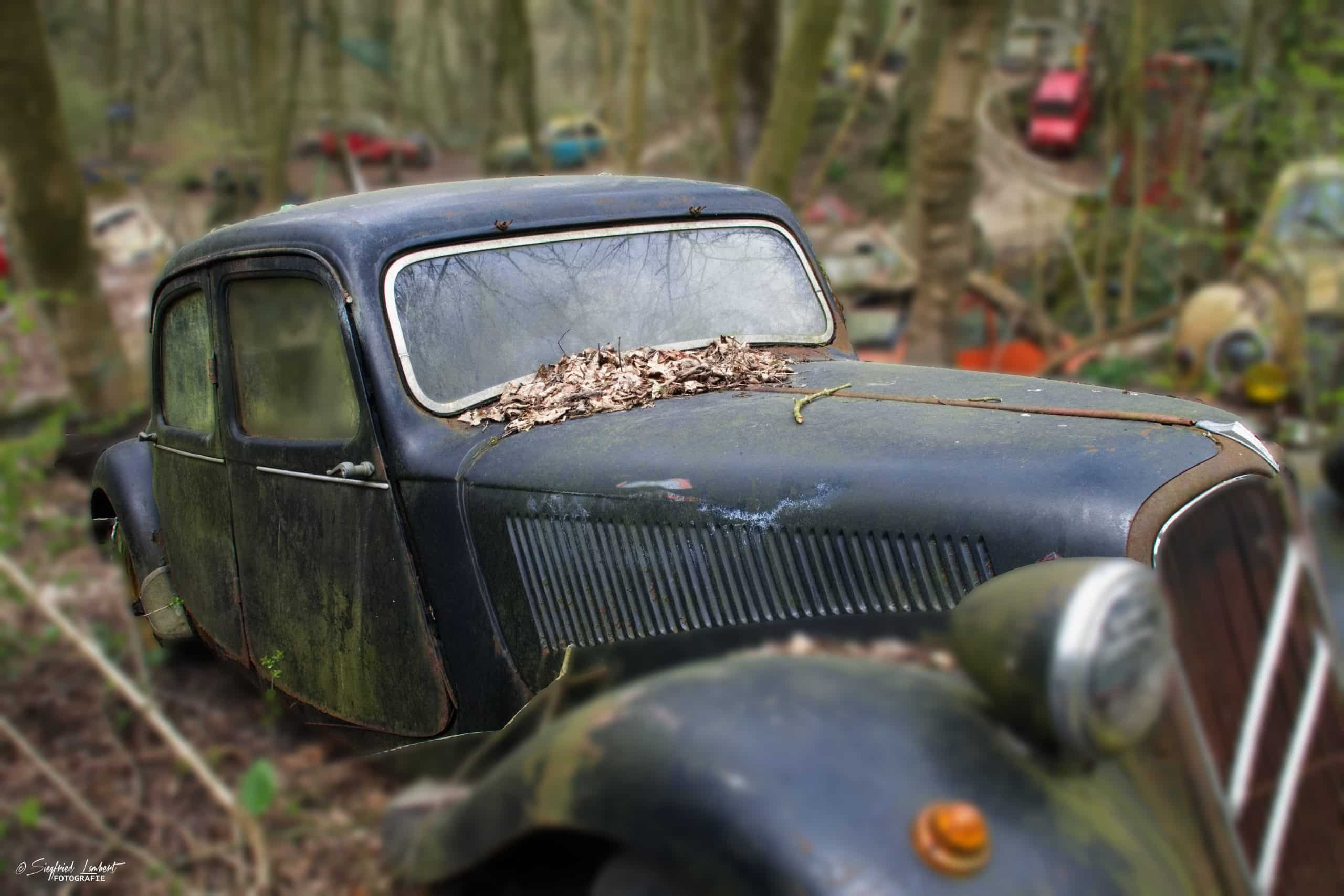 Schneckenhäuser sind in den Karosserieecken liegen geblieben und das Laub der vergangenen Jahre wirkt wie eine Naturpatina.