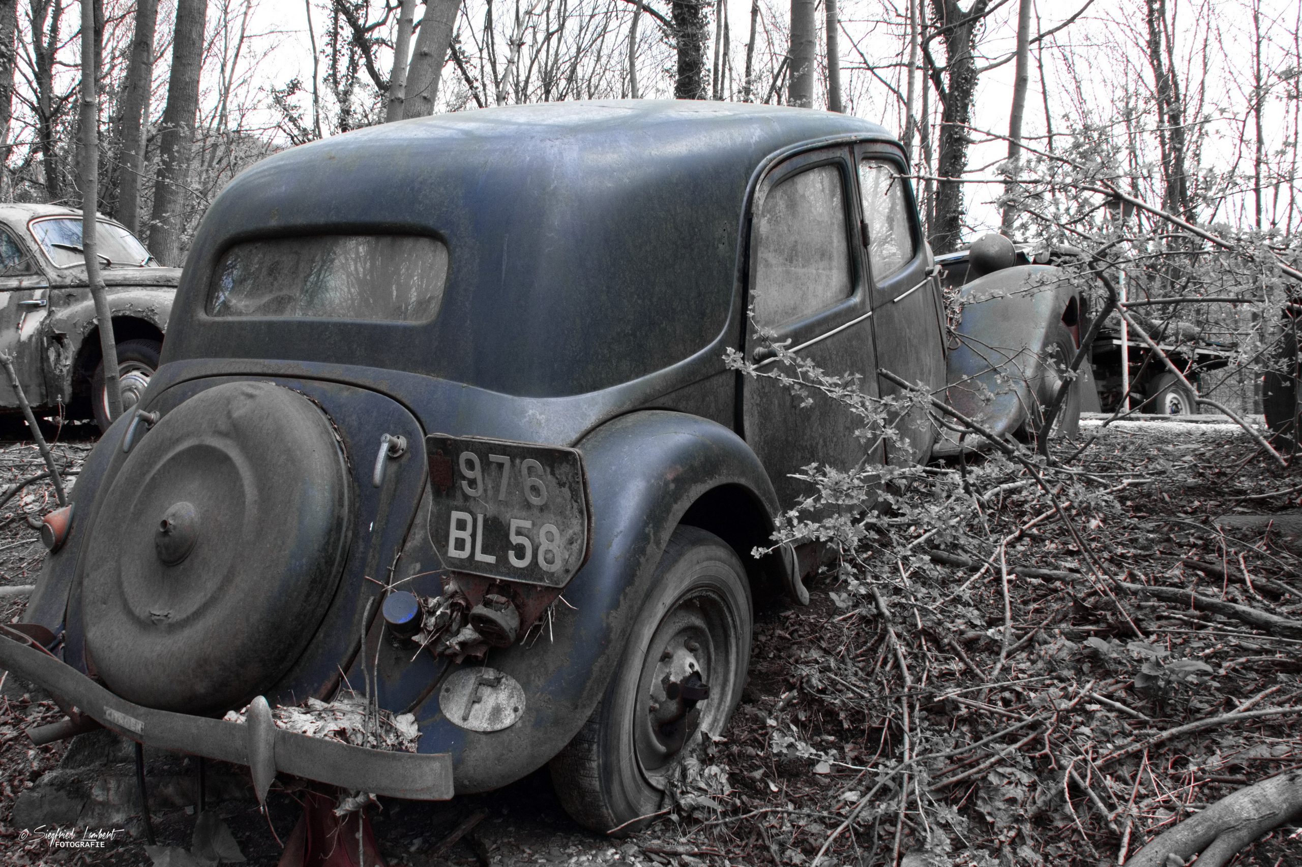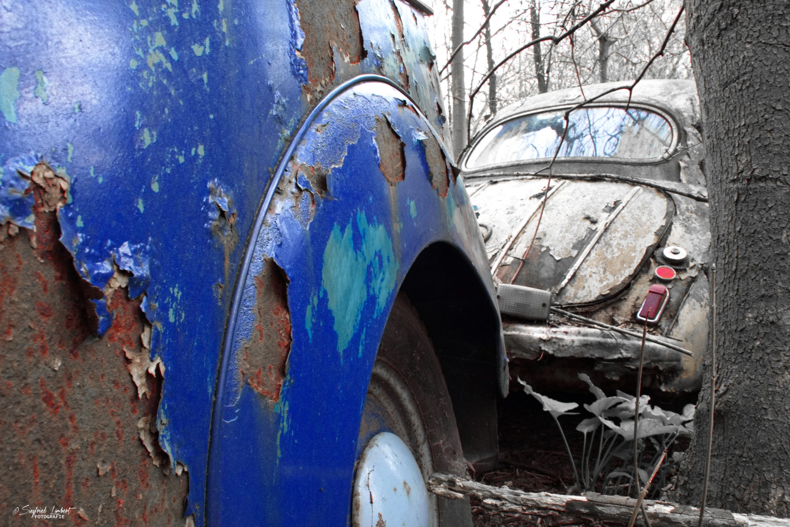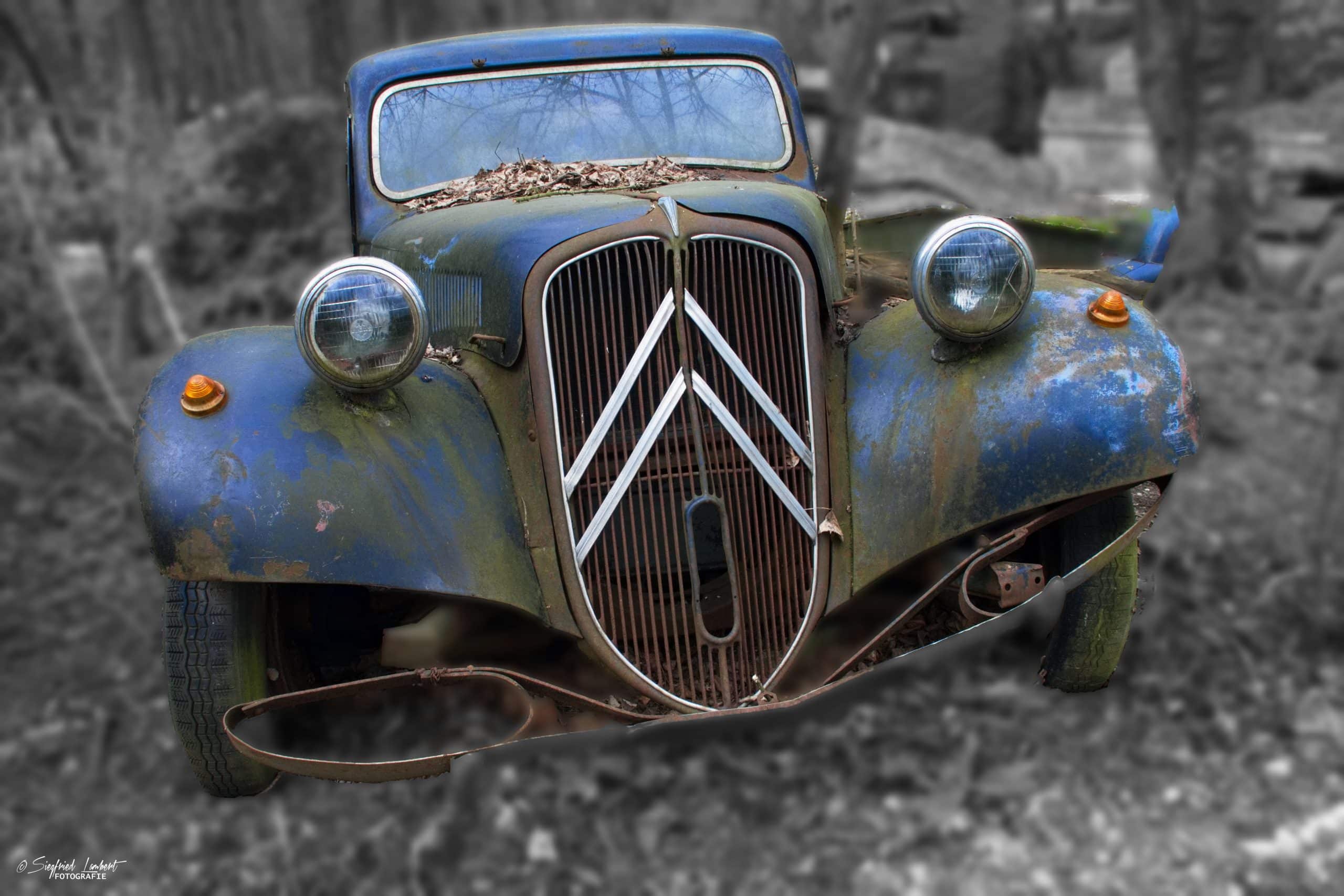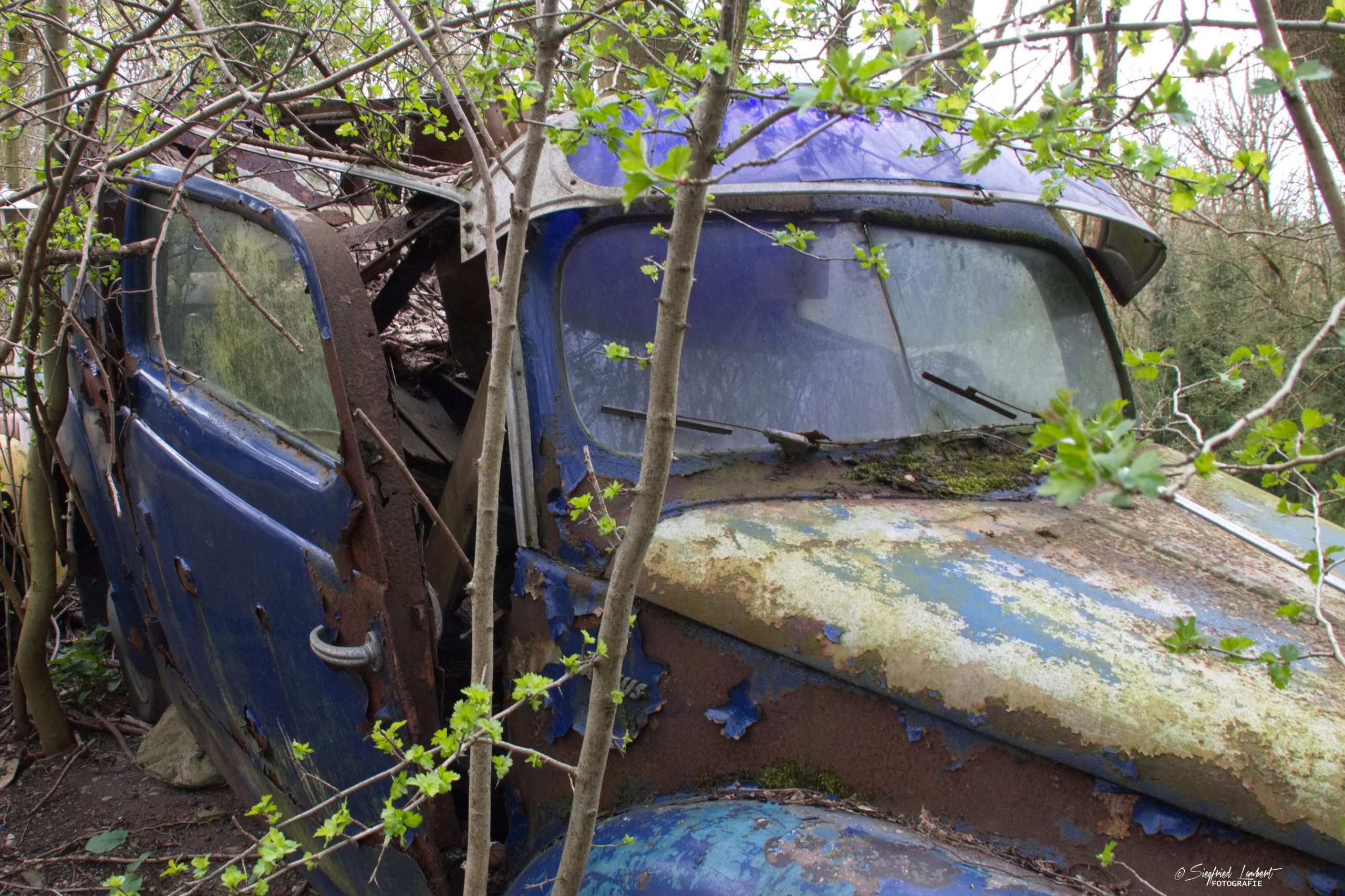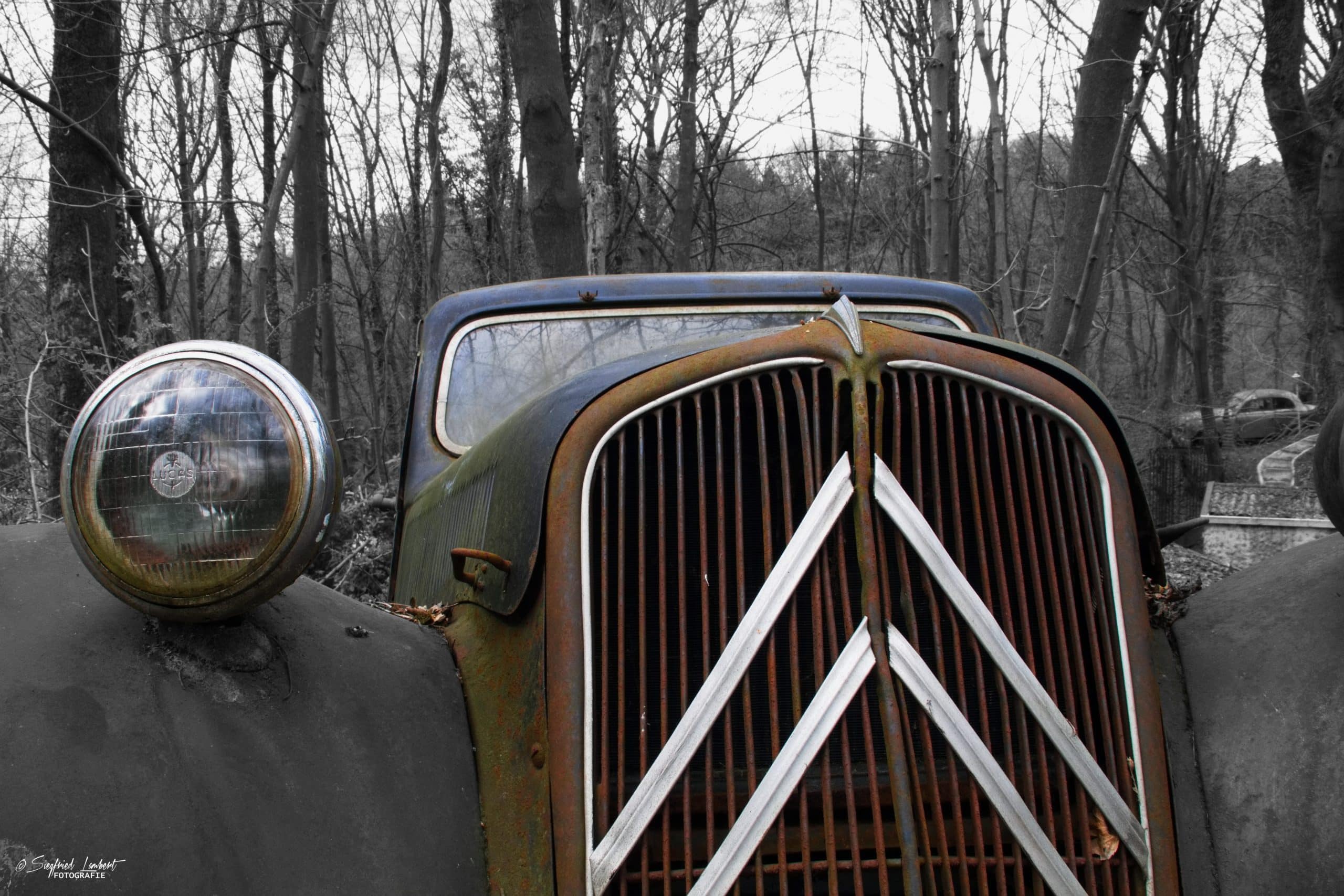 Schneckenhäuser sind in den Karosserieecken liegen geblieben und das Laub der vergangenen Jahre wirkt wie eine Naturpatina.